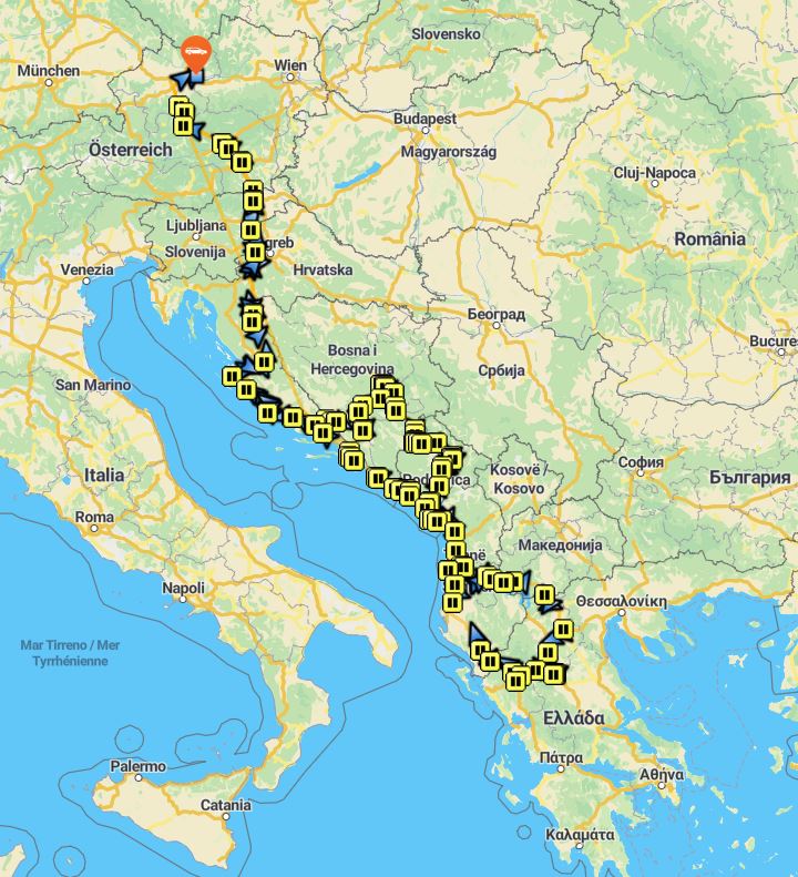 Linz – Wien – Split (Nachtzug) – Grenzübergang Gornji Vinjani (CRO/BIH) – Mostar – Sarajevo – Abstecher Visoko (bosnische Pyramiden) – Grenzübergang Šćepan Polje (BIH/MNE) – Piva Canyon/Plužine – Durmitor Nationalpark – Tara Brücke – Biogradska Gora Nationalpark – Kloster Morača – Podgorica – Grenzübergang Pika Kufitare Muriqan (MNE/ALB) – Shkodra – Tirana – Grenzübergang Kjafasan (ALB/NMK) – Ohrid – Grenzübergang Niki (NMK/GRC) – Kozani – Kalambaka (Meteora Klöster) – Ioannina – Grenzübergang Kakavi (GRC/ALB) – Gjirokastra – Durrës – Grenzübergang Pika Kufitare Muriqan (ALB/MNE) – Bar – Budva – Kotor – Grenzübergang Debeli Brijeg bzw. Karasovići (MNE/CRO) – Dubrovnik – Grenzübergänge bei Neum (CRO/BIH, BIH/CRO) – Makarska – Split – Zadar – Plitvička Jezera (Plitvica Seen) – Grenzübergang Macelj (CRO/SVN) – Maribor – Graz – Linz
