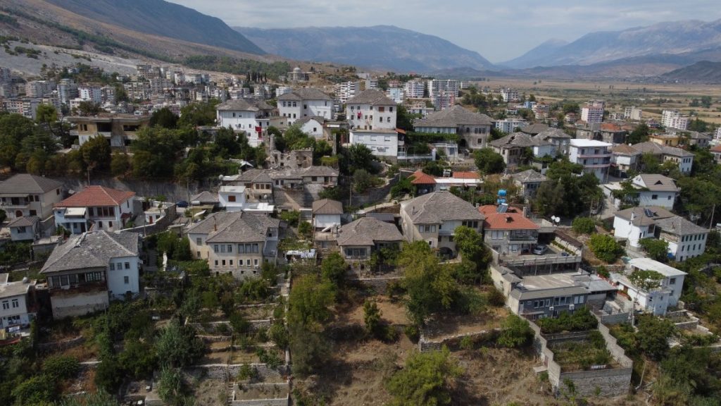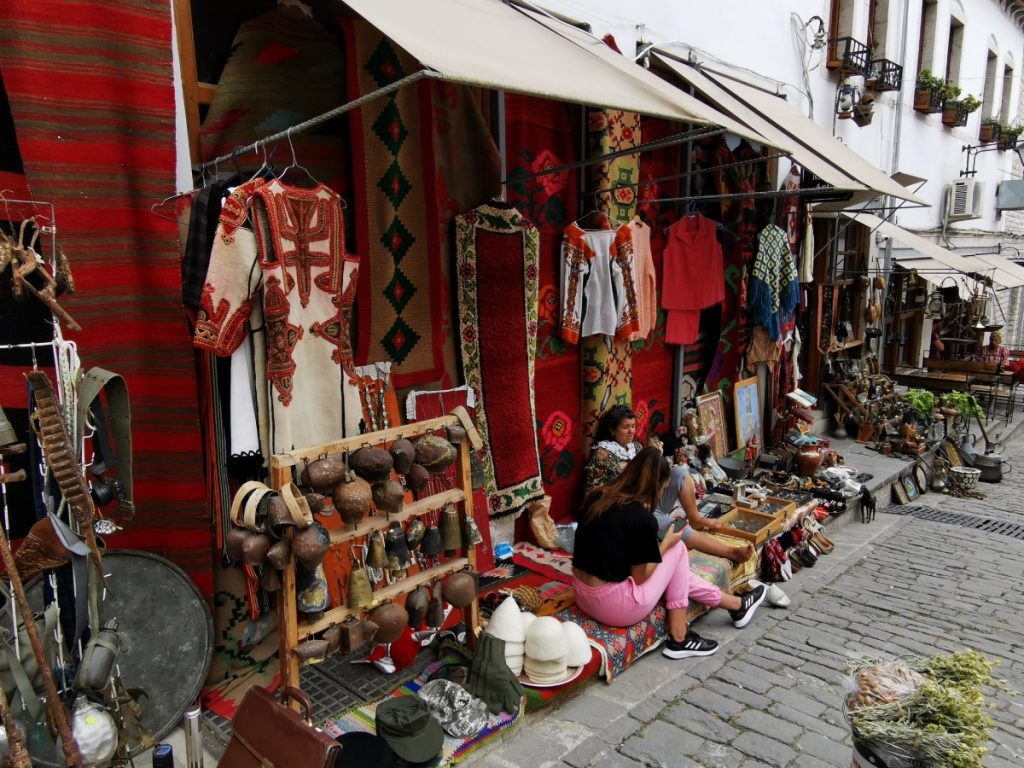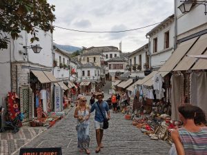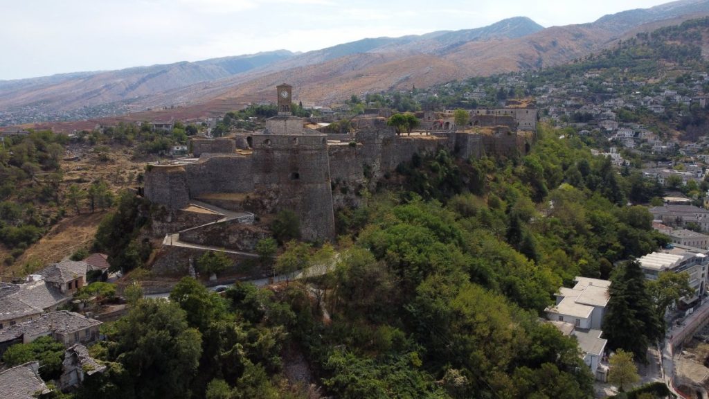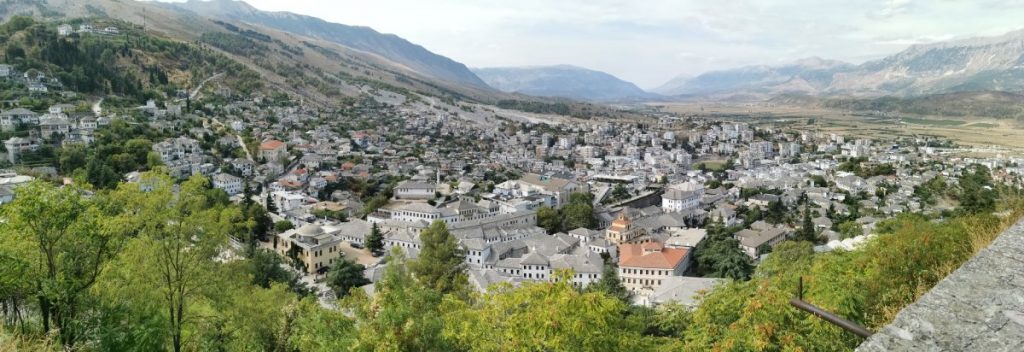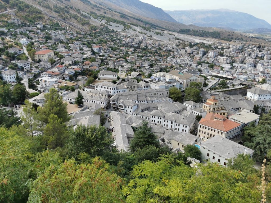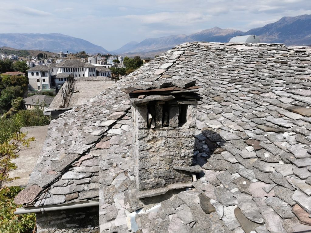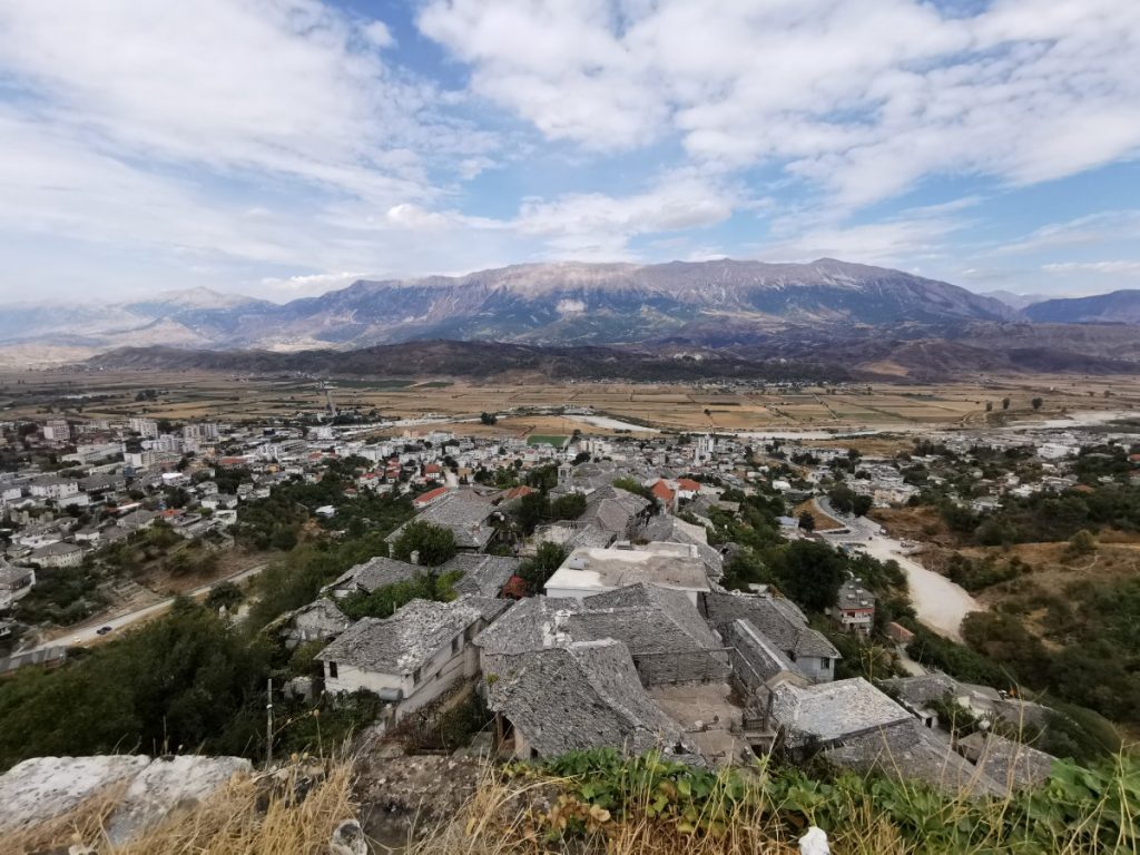 Meine Reise führte mich in die UNESCO-Welterbestadt Gjirokastra (gelistet zusammen mit Berat), die älteste Stadt Albaniens, welche bereits seit der Antike besiedelt wurde. Insbesondere die Osmanen, welche Gjirokastra im 15. Jahrhundert eroberten, drückten der Stadt ihren Stempel auf. Heute ist sie für die mit Steinplatten gedeckten Häuser (daher der Beiname „Stadt der Steine„), die kunstvoll gepflasterten, steilen Gassen und die imposante Festungsanlage bekannt. Die ausgedehnte Anlage aus dem 12. – 19. Jahrhundert am Osthang des Mali i Gjerë Gebirges überblickt in strategischer Position den Fluss Drino und die Dropull-Ebene, deren fruchtbare Felder an beiden Seiten von steilen Gebirgshängen begrenzt werden. Besonders beeindruckend fand ich die riesigen Kasematten, die eine Vielzahl an militärischem Equipment beherrbergen. Die rund 500 Meter lange Burg kann eigenständig gegen eine kleine Eintrittsgebühr erkundet werden.