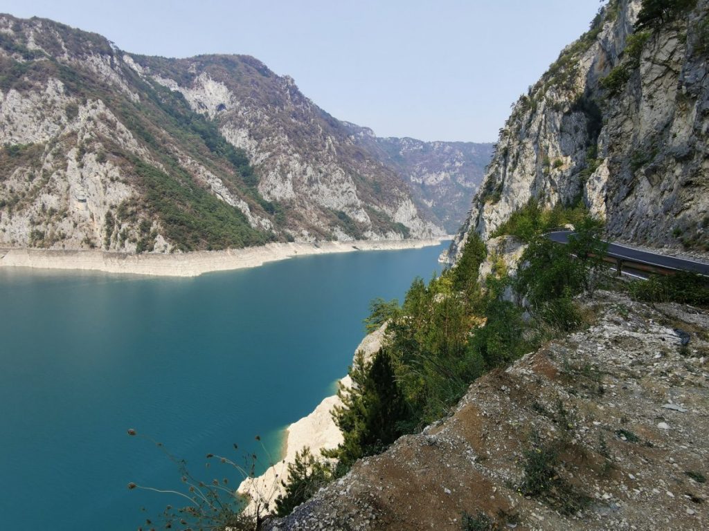 Meine Reise durch dieses faszinierende Land begannt im Norden des Landes. Dort folgte ich der aufgestauten Piva, deren türkisblaues Wasser tief unten im Canyon schimmertet. Zahlreiche Aussichtspunkte eröffnen sich entlang der Strecke. Die Straße schlängelt sich entlang des Abbruchs und zwängt sich immer wieder durch schmale, unbeleuchtete Tunnel im Fels. Wieder war ich über meine Zusatzscheinwerfer dankbar, die mich diverse Schlaglöcher gut erkennen ließen. Der ständige Wechsel von Hell zu Dunkel und wieder zu Hell ist gewöhnungsbedürftig; die Augen brauchten ein paar Sekunden, um sich anzupassen. Das erste Mal seit Reisebeginn traf ich wieder auf ein paar vereinzelte Motorradfahrer, man grüßte sich. Ich hielt hoch oben an einem Aussichtspunkt und ließ die Szenerie auf mich wirken.